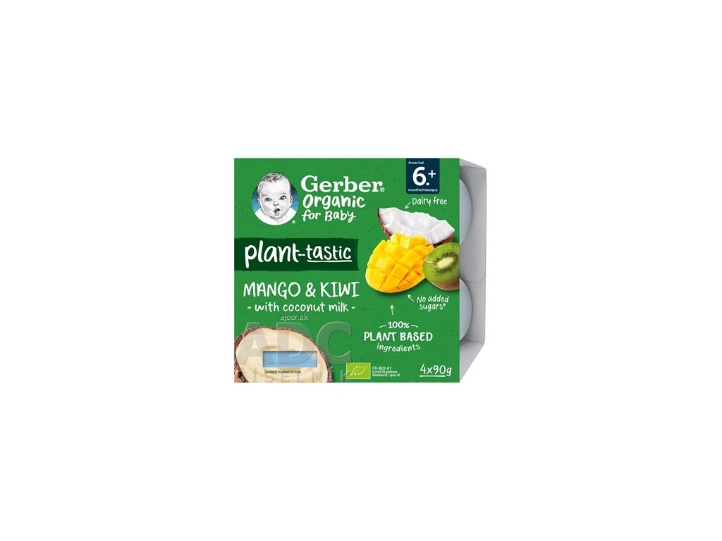 GERBER Organic 100% rastlinný dezert mango a kiwi s kokosovým mliekom. BIO ovocná desiata. Od ukončeného 6. mesiaca. Pasterizované. Balené v ochrannej atmosfére.