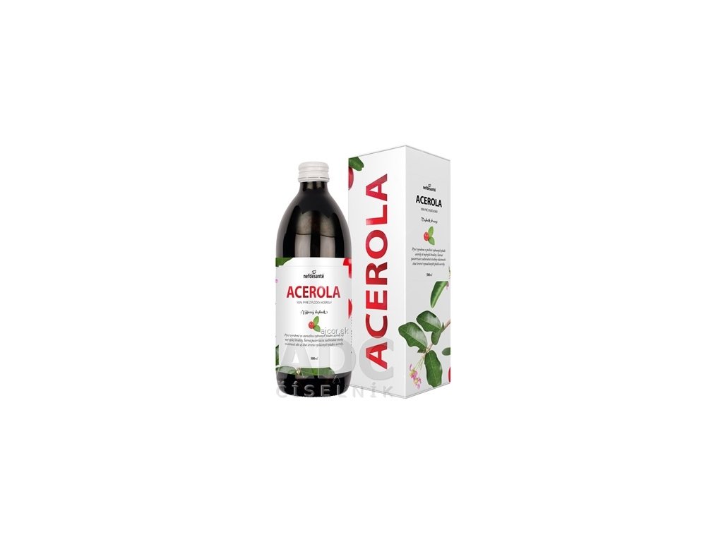 Výživový doplnok, 100 % pasterizované pyré vyrobené zo starostlivo vybraných plodov Aceroly (Malpighia glabra L.) s prírodným vitamínom C. 500 ml fľaša zabalené v krabičke.