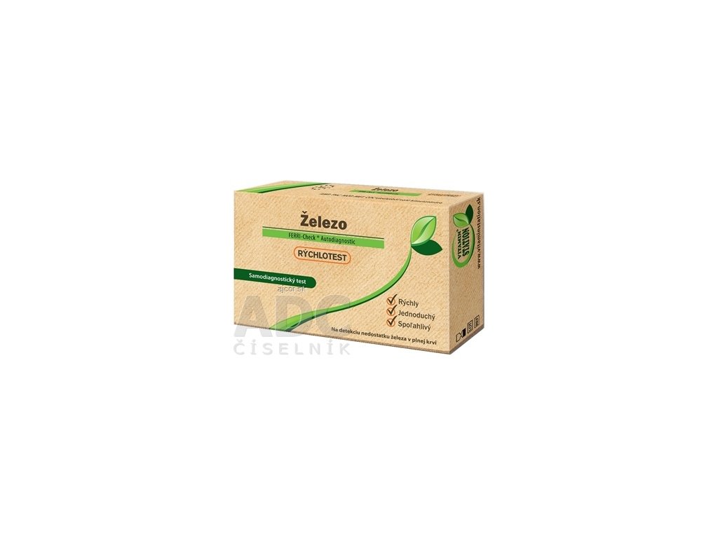 Test Železo je samodiagnostický rýchlotest pre stanovenie hladiny feritínu (proteín umožňujúci skladovanie železa v bunkách) zo vzorky plnej krvi pichnutím prsta. Viac na adc.sk